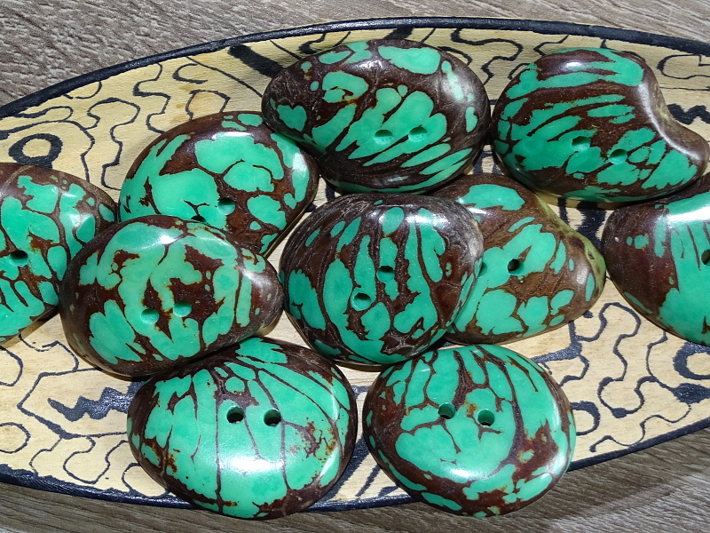 Výrazný knoflík z velké placky tagua, řez ořechu z palmy zvané slonovník (přírodní slonovina), perforovaný 2 dírkami, s přírodní kresbou.