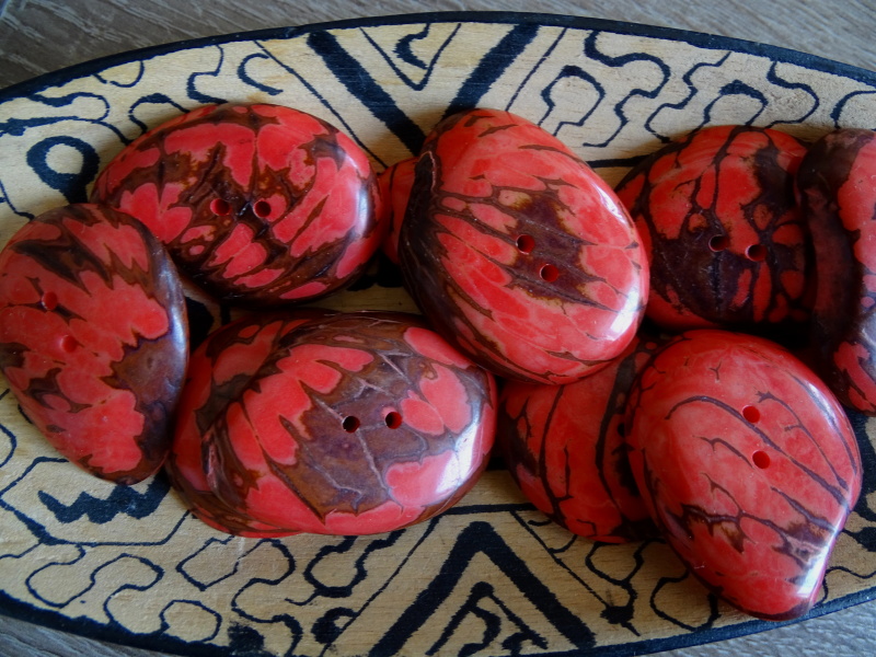 Výrazný knoflík z velké placky tagua, řez ořechu z palmy zvané slonovník (přírodní slonovina), perforovaný 2 dírkami, s přírodní kresbou.