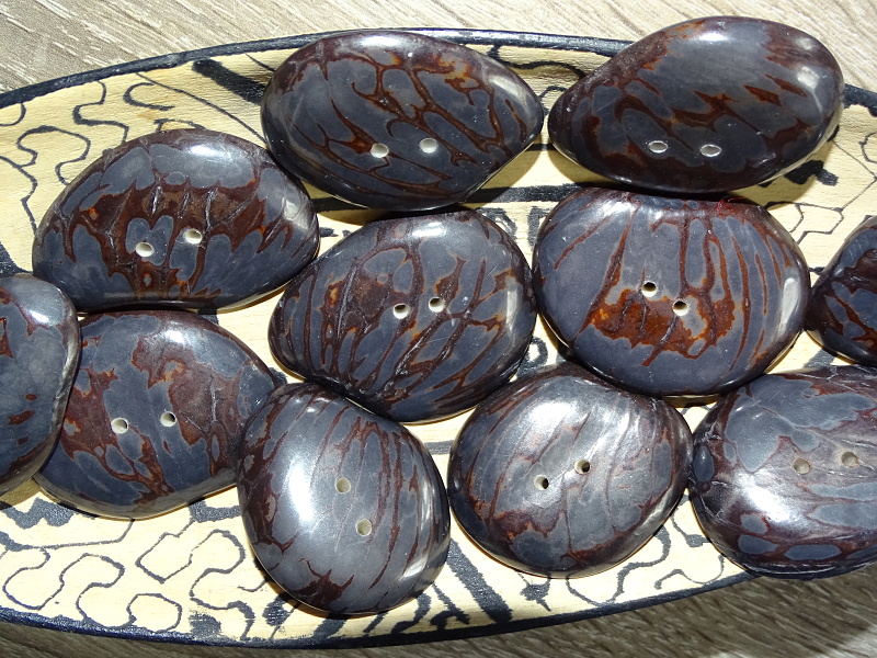 Výrazný knoflík z velké placky tagua, řez ořechu z palmy zvané slonovník (přírodní slonovina), perforovaný 2 dírkami, s přírodní kresbou.