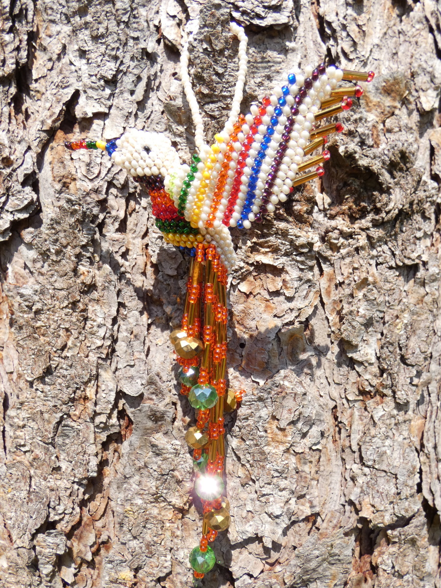 Kolibřík z korálků, překrásné provedení, barevný a zářivý. Očko k zavěšení (na okno, na batoh, na kabelku, kdekoli doma). Když ho dáte na sluníčko nebo pod lustr, úplně se rozzáří:-)