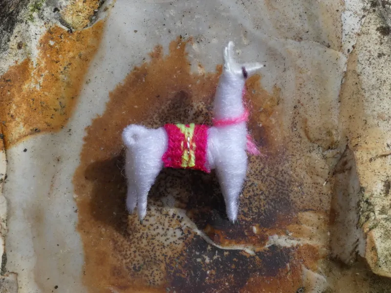 Minibrož ve tvaru malé lamy, omotané lamí vlnou, ozdobené peruánskou látkou, spínací špendlík.