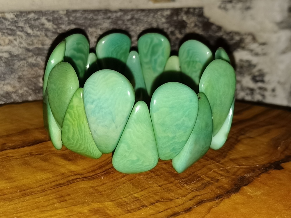 Náramek ze semen tagua (přírodní slonovina), krásně sedí na ruce, netlačí, na omak velmi příjemný materiál, s přírodní kresbou.