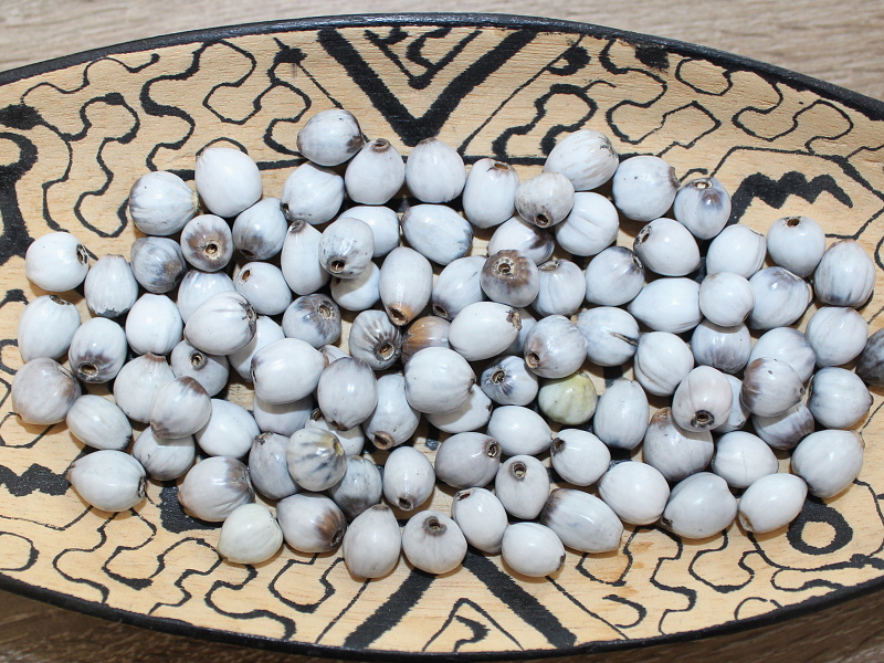 Semeno světle šedé barvy ve tvaru slziček, perforované.