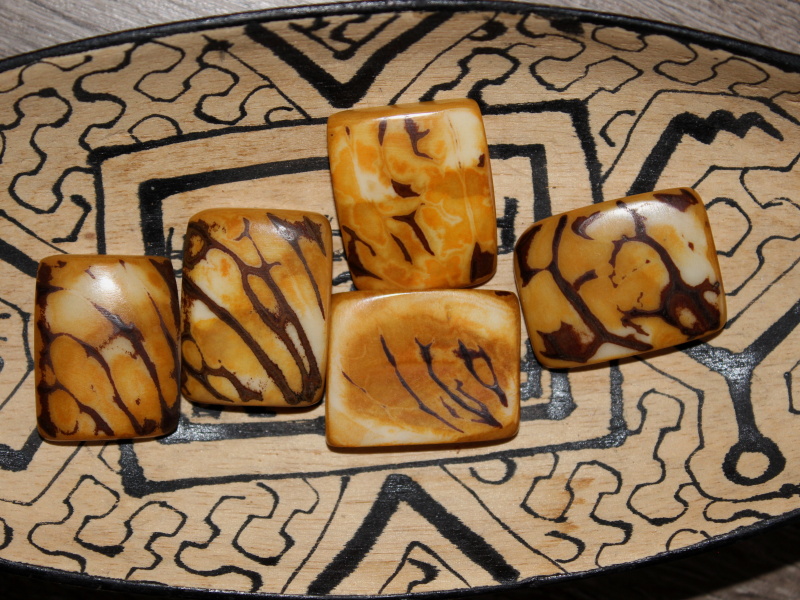 Placatý obdélník, řez semene z palmy zvané slonovník (přírodní slonovina), perforovaný, s přírodní kresbou. Dvě dírky skrz, použitelné na náramek nebo náhrdelník.