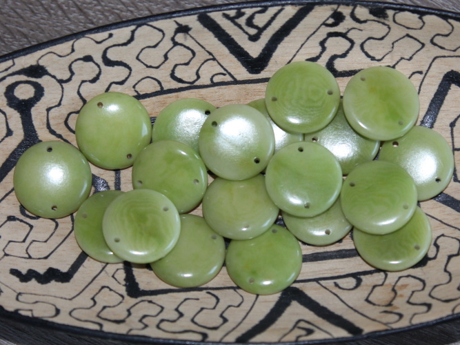 Kulatá, silná placička tagua ze semene palmy zvané slonovník (přírodní slonovina), 2 x perforovaná.