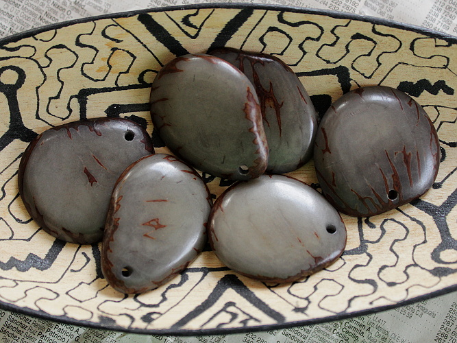 Velká placka tagua, řez semene z palmy zvané slonovník (přírodní slonovina), perforovaný, s přírodní kresbou.
