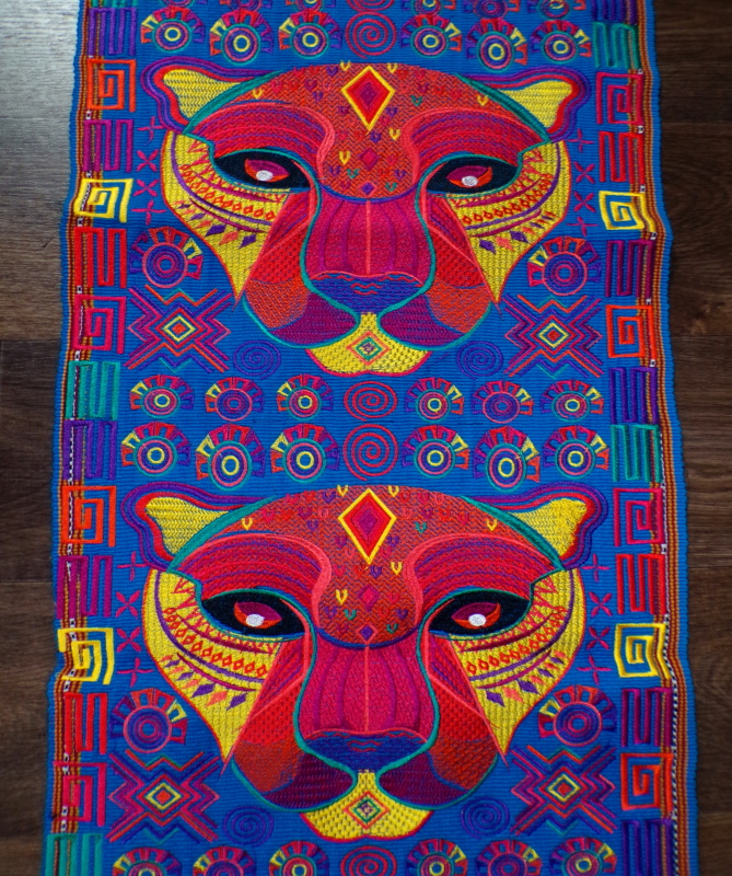 Vyšívaný běhoun s jaguáry. Vhodný na stůl, na zem, vypadá fantasticky i na zdi.