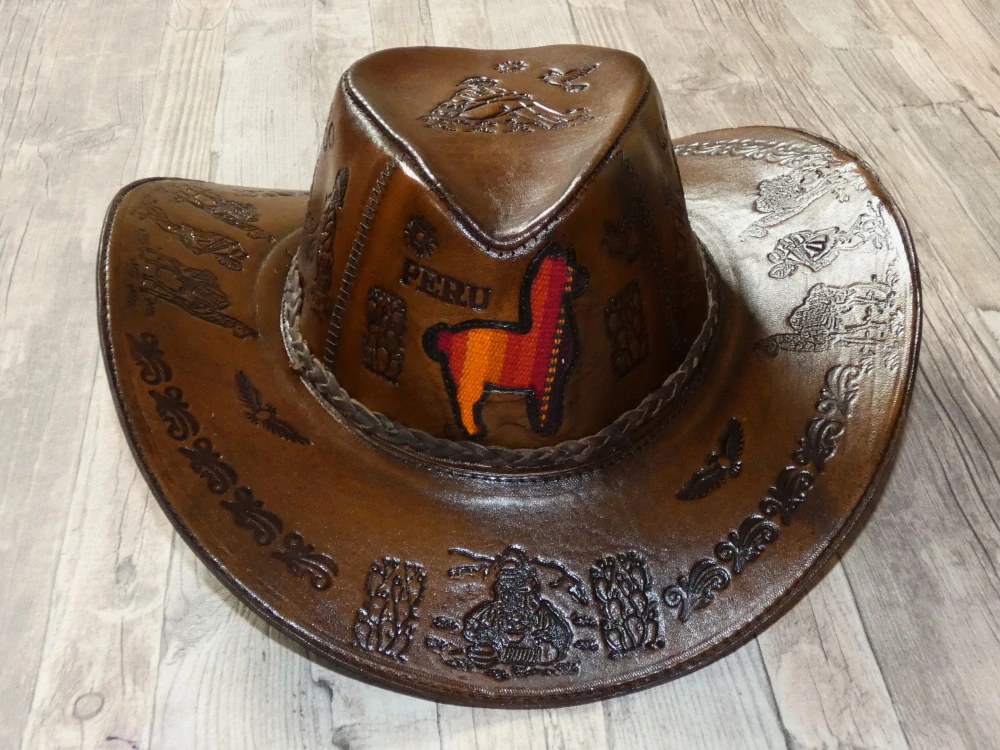 Originální kožený klobouk s peruánskými motivy, pevný, příjemný na nošení.