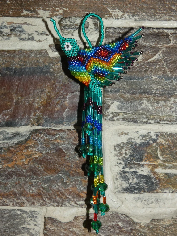 Kolibřík z korálků, překrásné provedení, barevný a zářivý. Očko k zavěšení (na okno, na batoh, na kabelku, kdekoli doma). Když ho dáte na sluníčko nebo pod lustr, úplně se rozzáří.