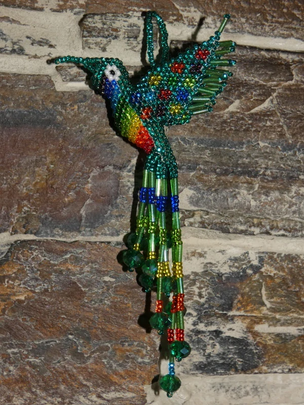 Kolibřík z korálků, překrásné provedení, barevný a zářivý. Očko k zavěšení (na okno, na batoh, na kabelku, kdekoli doma). Když ho dáte na sluníčko nebo pod lustr, úplně se rozzáří.