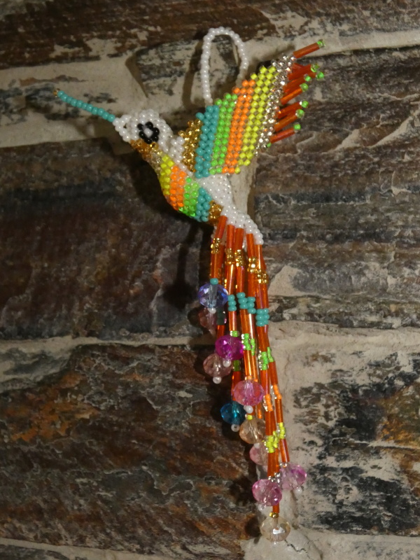 Kolibřík z korálků, překrásné provedení, barevný a zářivý. Očko k zavěšení (na okno, na batoh, na kabelku, kdekoli doma). Když ho dáte na sluníčko nebo pod lustr, úplně se rozzáří:-)