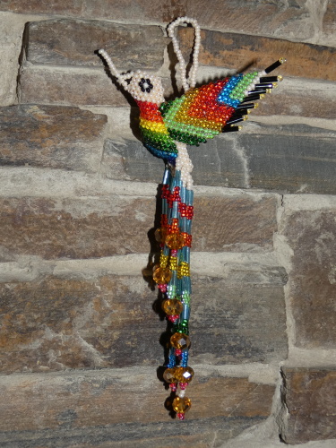 Kolibřík z korálků, překrásné provedení, barevný a zářivý. Očko k zavěšení (kdekoli doma, na okno, na batoh, na kabelku, do auta, na vánoční stromek, na krmítko, na zahradu). Když ho dáte na sluníčko nebo pod lustr, úplně se rozzáří.