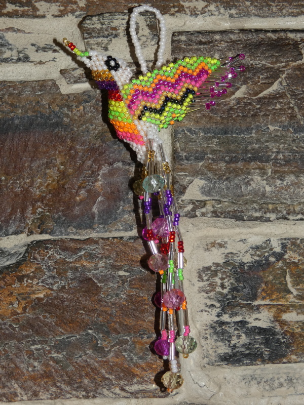 Kolibřík z korálků, překrásné provedení, barevný a zářivý. Očko k zavěšení (kdekoli doma, na okno, na batoh, na kabelku, do auta, na vánoční stromek, na krmítko, na zahradu). Když ho dáte na sluníčko nebo pod lustr, úplně se rozzáří.