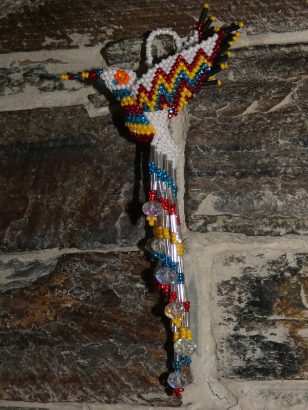 Kolibřík z korálků, překrásné provedení, barevný a zářivý. Očko k zavěšení (na okno, na batoh, na kabelku, kdekoli doma). Když ho dáte na sluníčko nebo pod lustr, úplně se rozzáří:-)