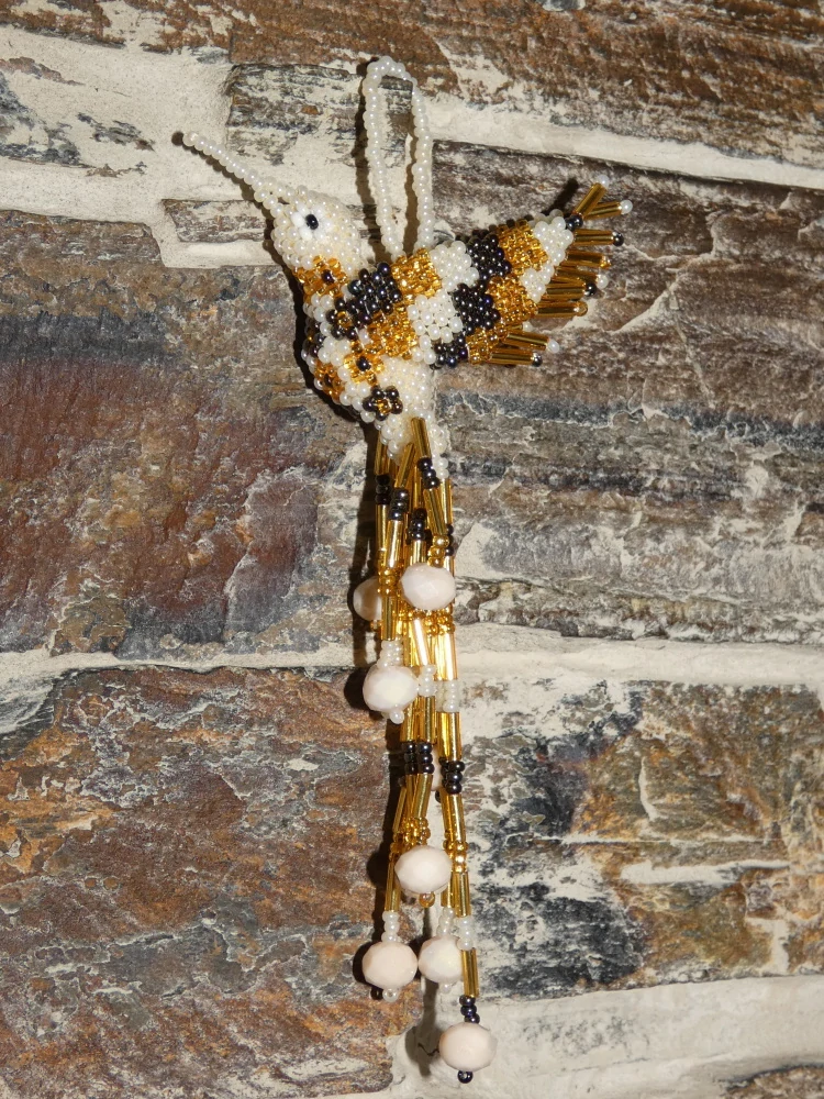 Kolibřík z korálků, překrásné provedení, barevný a zářivý. Očko k zavěšení (kdekoli doma, na okno, na batoh, na kabelku, do auta, na vánoční stromek, na krmítko, na zahradu). Když ho dáte na sluníčko nebo pod lustr, úplně se rozzáří.