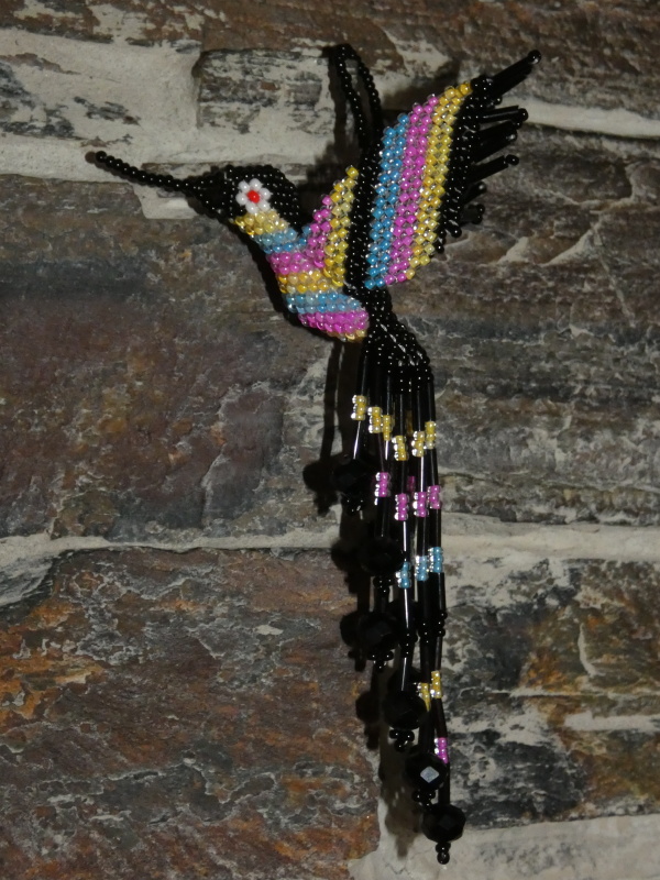 Kolibřík z korálků, překrásné provedení, barevný a zářivý. Očko k zavěšení (na okno, na batoh, na kabelku, kdekoli doma). Když ho dáte na sluníčko nebo pod lustr, úplně se rozzáří:-)