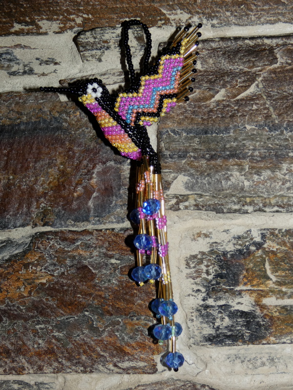 Kolibřík z korálků, překrásné provedení, barevný a zářivý. Očko k zavěšení (kdekoli doma, na okno, na batoh, na kabelku, do auta, na vánoční stromek, na krmítko, na zahradu). Když ho dáte na sluníčko nebo pod lustr, úplně se rozzáří.