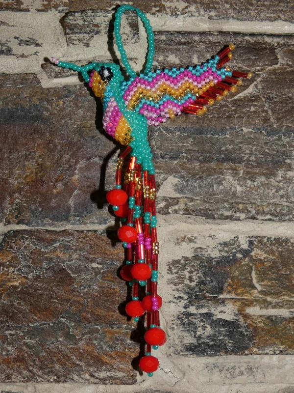 Kolibřík z korálků, překrásné provedení, barevný a zářivý. Očko k zavěšení (kdekoli doma, na okno, na batoh, na kabelku, do auta, na vánoční stromek, na krmítko, na zahradu). Když ho dáte na sluníčko nebo pod lustr, úplně se rozzáří.
