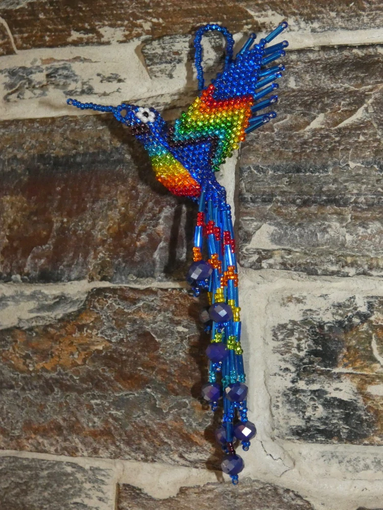 Kolibřík z korálků, překrásné provedení, barevný a zářivý. Očko k zavěšení (na okno, na batoh, na kabelku, kdekoli doma). Když ho dáte na sluníčko nebo pod lustr, úplně se rozzáří.
