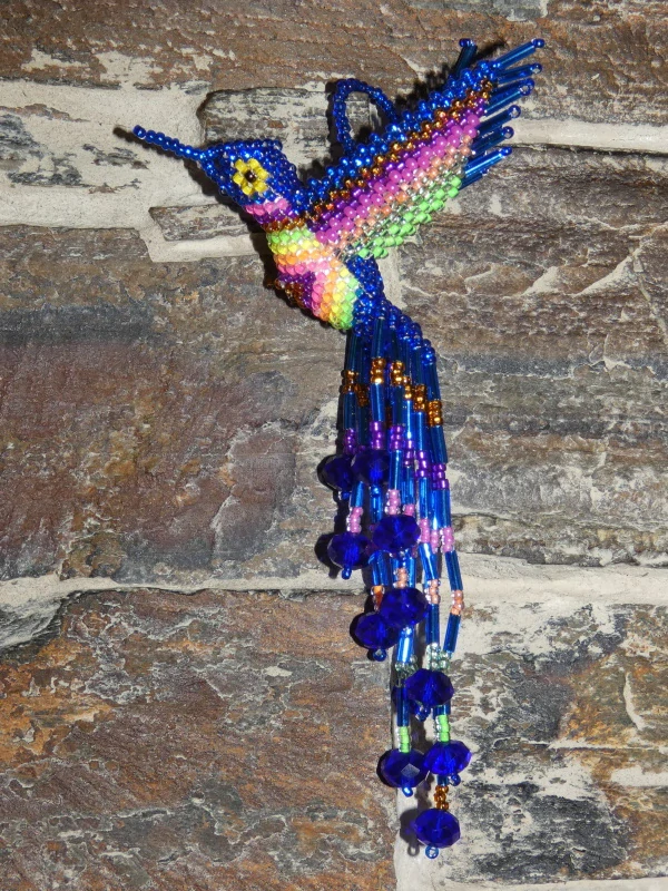 Kolibřík z korálků, překrásné provedení, barevný a zářivý. Očko k zavěšení (na okno, na batoh, na kabelku, kdekoli doma). Když ho dáte na sluníčko nebo pod lustr, úplně se rozzáří:-)