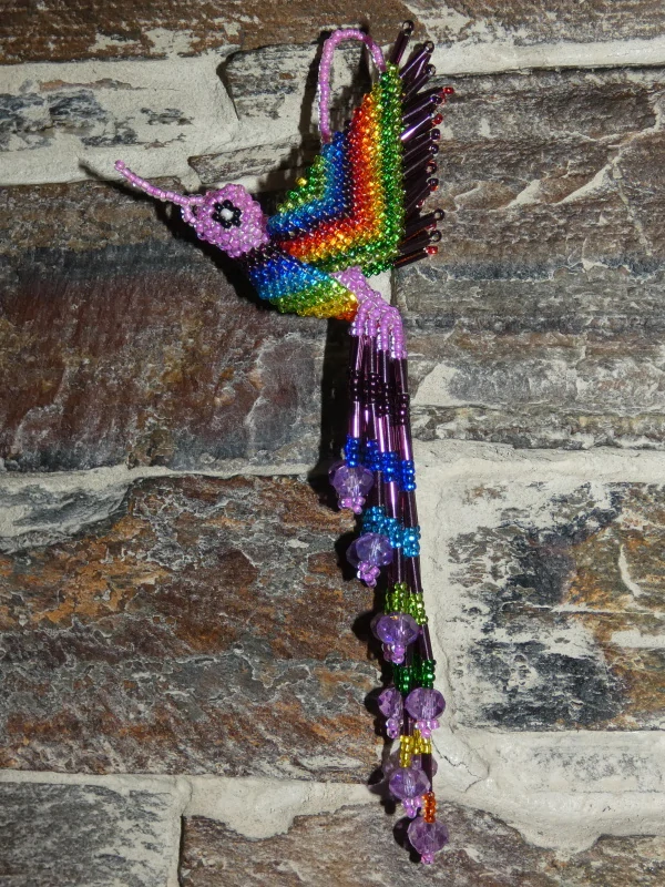 Kolibřík z korálků, překrásné provedení, barevný a zářivý. Očko k zavěšení (na okno, na batoh, na kabelku, kdekoli doma). Když ho dáte na sluníčko nebo pod lustr, úplně se rozzáří.