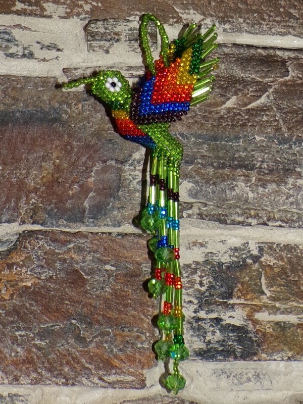 Kolibřík z korálků, překrásné provedení, barevný a zářivý. Očko k zavěšení (na okno, na batoh, na kabelku, kdekoli doma). Když ho dáte na sluníčko nebo pod lustr, úplně se rozzáří.