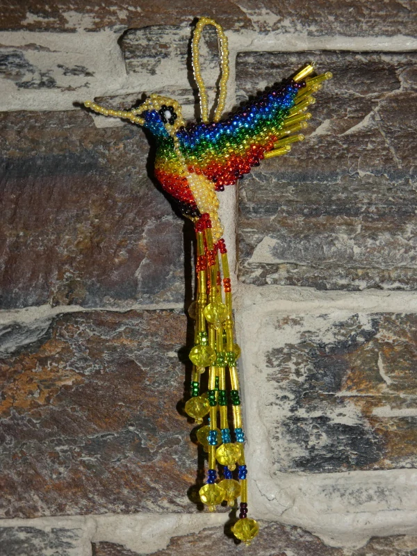 Kolibřík z korálků, překrásné provedení, barevný a zářivý. Očko k zavěšení (na okno, na batoh, na kabelku, kdekoli doma). Když ho dáte na sluníčko nebo pod lustr, úplně se rozzáří:-)