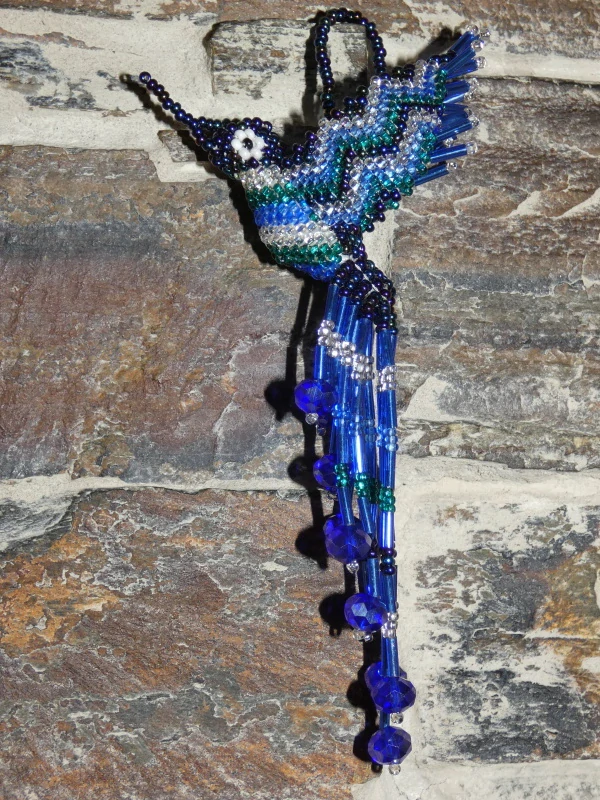 Kolibřík z korálků, překrásné provedení, barevný a zářivý. Očko k zavěšení (kdekoli doma, na okno, na batoh, na kabelku, do auta, na vánoční stromek, na krmítko, na zahradu). Když ho dáte na sluníčko nebo pod lustr, úplně se rozzáří.