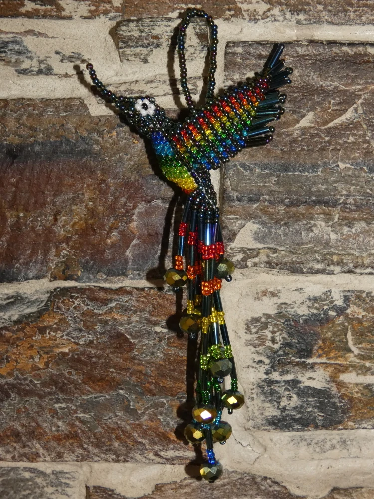 Kolibřík z korálků, překrásné provedení, barevný a zářivý. Očko k zavěšení (kdekoli doma, na okno, na batoh, na kabelku, do auta, na vánoční stromek, na krmítko, na zahradu). Když ho dáte na sluníčko nebo pod lustr, úplně se rozzáří.