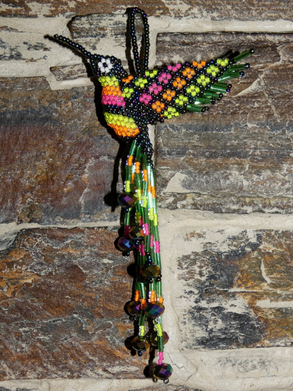 Kolibřík z korálků, překrásné provedení, barevný a zářivý. Očko k zavěšení (kdekoli doma, na okno, na batoh, na kabelku, do auta, na vánoční stromek, na krmítko, na zahradu). Když ho dáte na sluníčko nebo pod lustr, úplně se rozzáří.