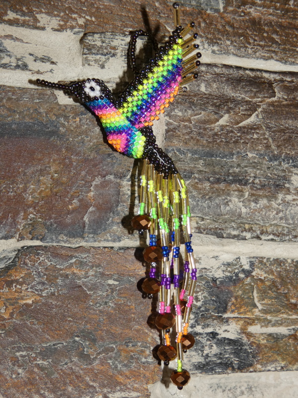 Kolibřík z korálků, překrásné provedení, barevný a zářivý. Očko k zavěšení (kdekoli doma, na okno, na batoh, na kabelku, do auta, na vánoční stromek, na krmítko, na zahradu). Když ho dáte na sluníčko nebo pod lustr, úplně se rozzáří.