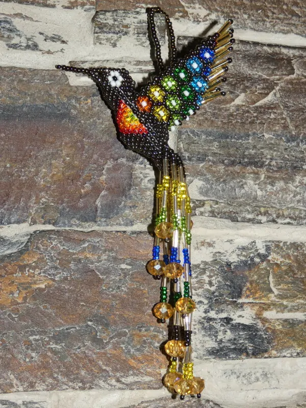 Kolibřík z korálků, překrásné provedení, barevný a zářivý. Očko k zavěšení (kdekoli doma, na okno, na batoh, na kabelku, do auta, na vánoční stromek, na krmítko, na zahradu). Když ho dáte na sluníčko nebo pod lustr, úplně se rozzáří.