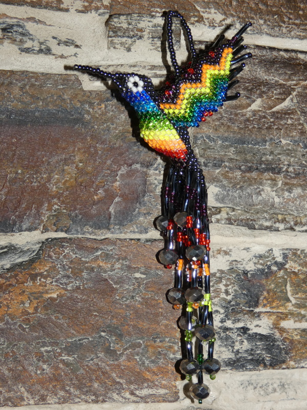 Kolibřík z korálků, překrásné provedení, barevný a zářivý. Očko k zavěšení (kdekoli doma, na okno, na batoh, na kabelku, do auta, na vánoční stromek, na krmítko, na zahradu). Když ho dáte na sluníčko nebo pod lustr, úplně se rozzáří.