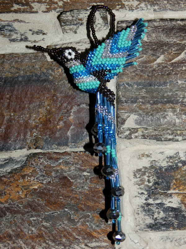 Kolibřík z korálků, překrásné provedení, barevný a zářivý. Očko k zavěšení (kdekoli doma, na okno, na batoh, na kabelku, do auta, na vánoční stromek, na krmítko, na zahradu). Když ho dáte na sluníčko nebo pod lustr, úplně se rozzáří.