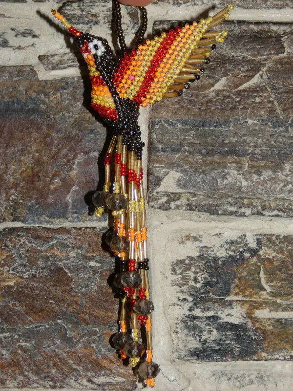 Kolibřík z korálků, překrásné provedení, barevný a zářivý. Očko k zavěšení (kdekoli doma, na okno, na batoh, na kabelku, do auta, na vánoční stromek, na krmítko, na zahradu). Když ho dáte na sluníčko nebo pod lustr, úplně se rozzáří.