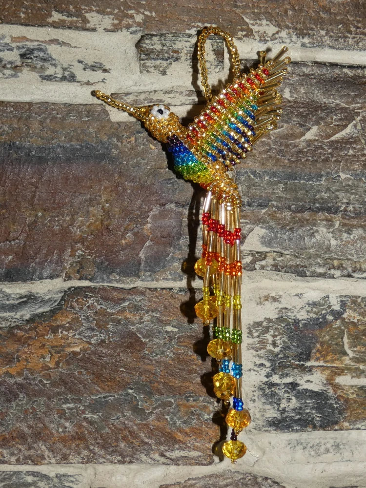Kolibřík z korálků, překrásné provedení, barevný a zářivý. Očko k zavěšení (kdekoli doma, na okno, na batoh, na kabelku, do auta, na vánoční stromek, na krmítko, na zahradu). Když ho dáte na sluníčko nebo pod lustr, úplně se rozzáří.