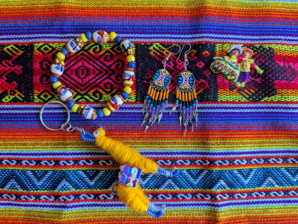 Obsahuje: přívěsek lama, brož indiánci, barevné náušnice, peruánský náramek a malý ubrus z peruánské látky.