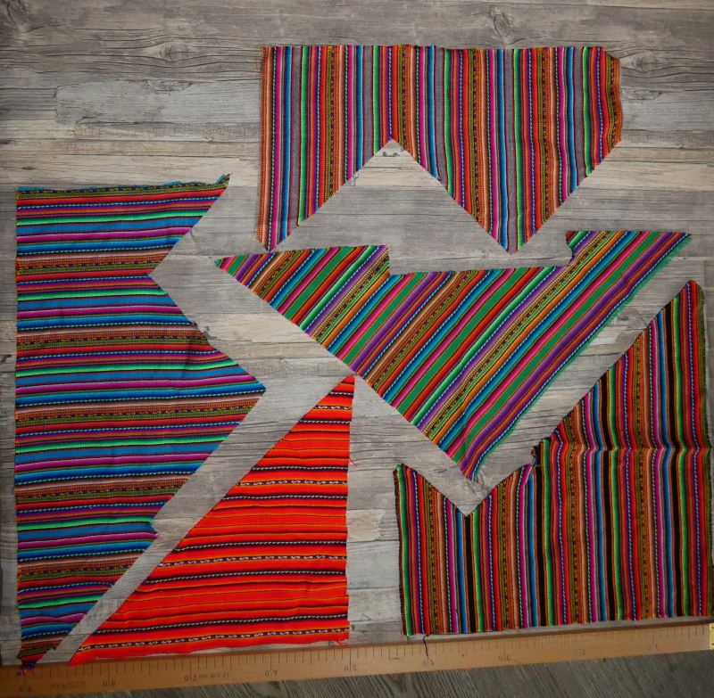 Odstřižky peruánských látek, 5 ks, vhodné na drobné ozdoby nebo doplňky.