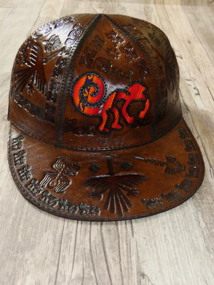 Originální kožená kšiltovka s peruánskými motivy, pevná, ale příjemná na nošení.