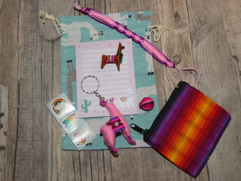 Obsahuje přívěsek lama, brož lama, bloček, samolepky, náramek přátelství, malá peněženka, korálek s peruánskou látkou, to vše v pytlíku s lamičkami.