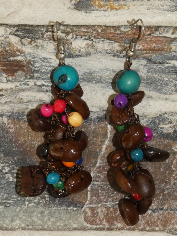 Náušnice z drobných semínek acai a kávových zrn.