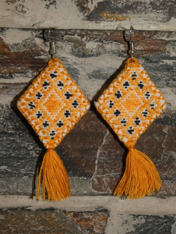 Barevné náušnice s barevné vyšívané látky s třásní.