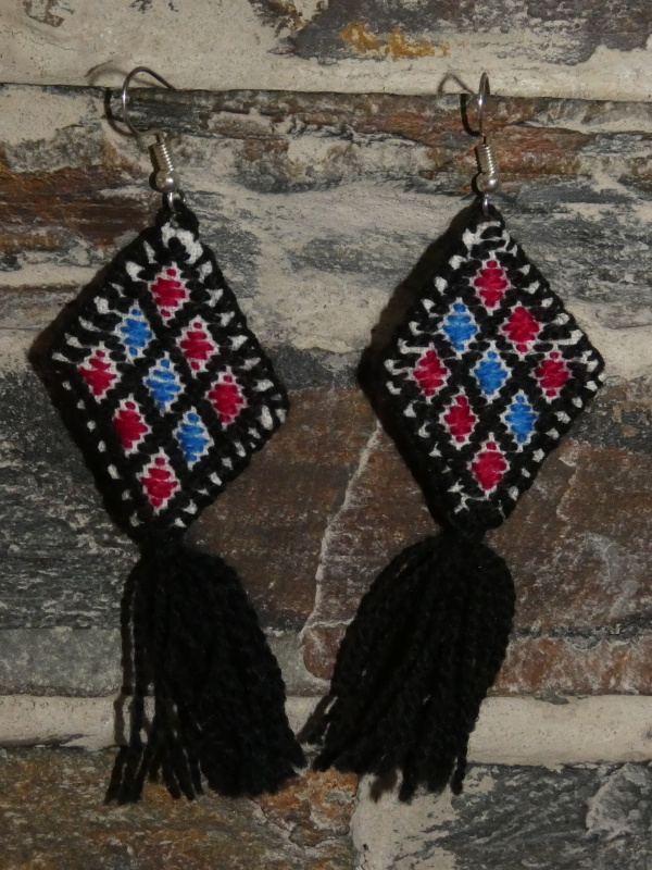 Barevné náušnice s barevné vyšívané látky s třásní.