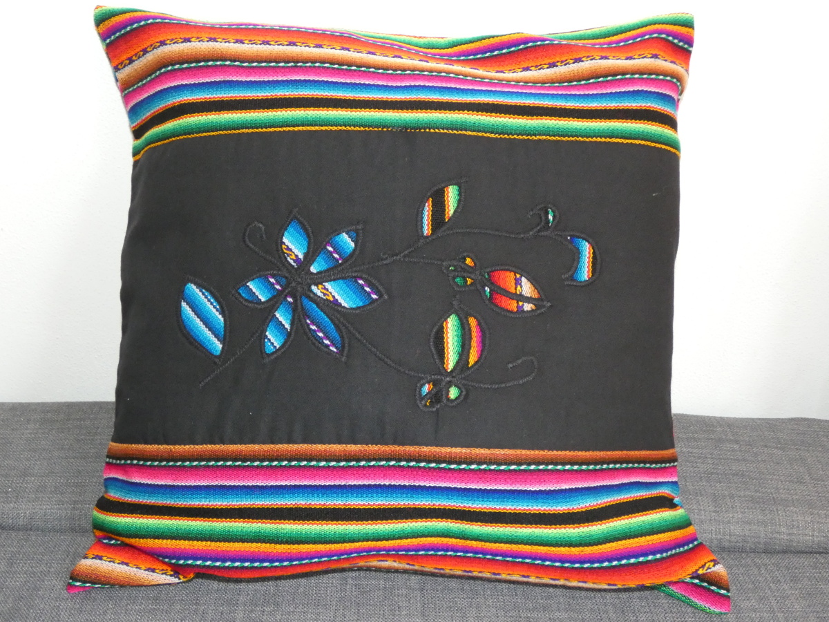 Polštářek z tradiční indiánské látky s originálním obrazcem vytvořeným technikou molas, z druhé strany bez obrazce. Rozepínání na zip pro snadné praní.