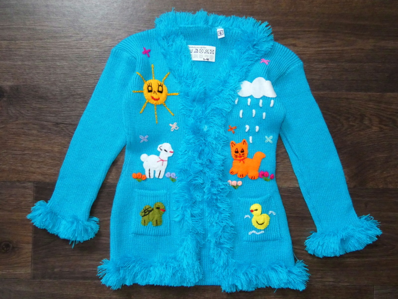 Nádherné svetry s krásnou výšivkou pro malé parádnice:-) Zapínání na knoflíček, kapsy.