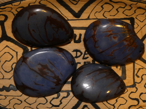 Velká placka tagua, řez semene z palmy zvané slonovník (přírodní slonovina), perforovaný, s přírodní kresbou.