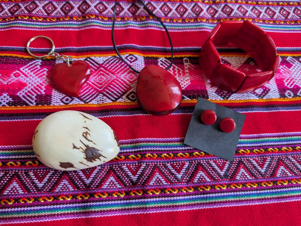 Obsahuje: náramek tagua, náušnice tagua, přívěsek tagua na kůži, přívěsek na klíče tagua, přírodní semeno ořechu tagua, mini ubrus z Peru
