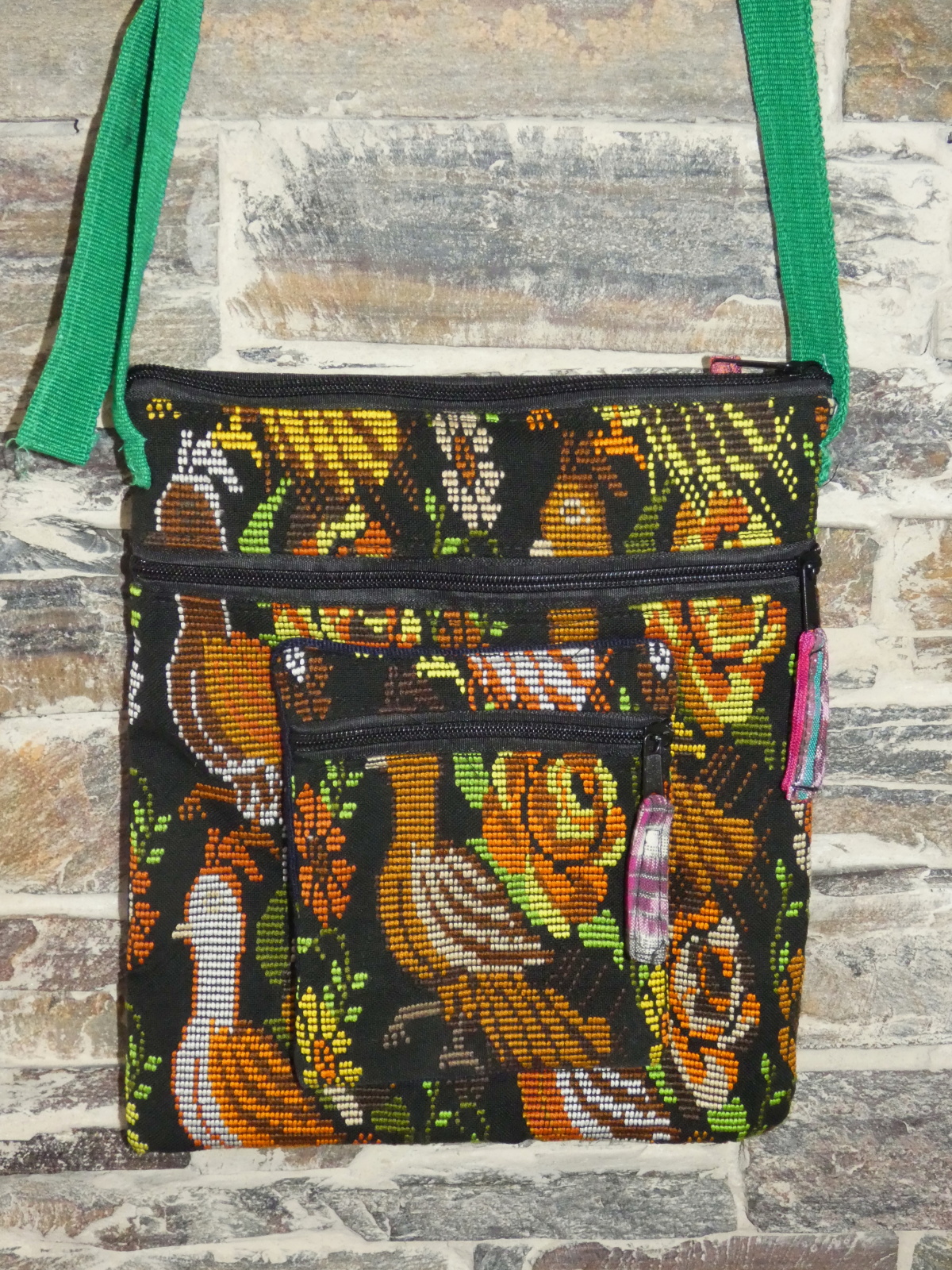 Taška přes rameno, několik kapsiček na zip, výšivka, popruh nastavitelný.